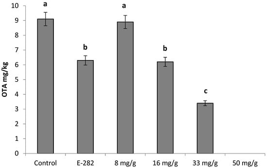 OTA produced by P. verrucosum growth in pita breads stored during 7 days in a plastic tray containing a small sachet sealed with 8, 16, 33 and 50 mg/g of oriental mustard flour sauce. Different letters show significant differences between treatments (p ≤ 0.05).
