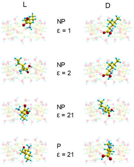 - Alvira, E. Influence of valine enantiomer configuration on the molecular dynamics simulation of their separation by β-cyclodextrin. Chem. Phys. Lett. 2017, 679, 31–37. [Google Scholar] [CrossRef]