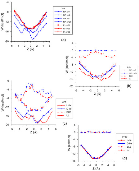The penetration potential W and its different contributions for the interaction between β–CD and (a) D-Ile in vacuo and with different solvents; (b) L-Ile in non-polar solvents; (c) Ile enantiomers in vacuo; (d) Ile enantiomers with water.