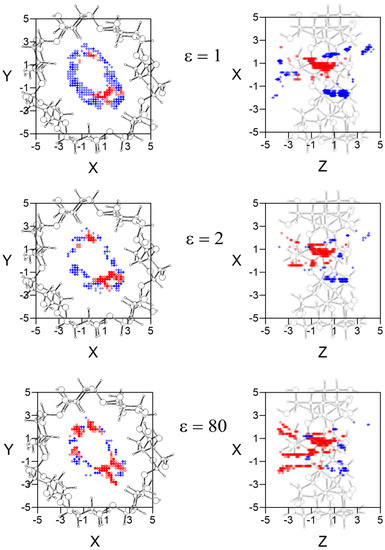 The W potential represents the minimum intermolecular energy through the cavity, but the guest does not always adopt the orientation of minimum energy in each location when it moves inside and outside β–CD. Therefore the potential energy surface for each enantiomer is determined at each grid point by the average Boltzmann energy for different guest orientations, instead of the lowest energy [16,17]. The most enantioselective regions for the different values of ε are inside the β–CD, and there are regions where L-Ile is more stable than D-Ile and vice versa. In order to clearly represent the results, Figure 3 shows the projections in XY and XZ planes of the points of potential surfaces with greater differences in energy, red circles correspond to locations in which L-Ile is more stable and blue crosses those for D-Ile. The bolder the symbol, the greater difference in energy it represents. A schematic representation of the projections of β–CD is included in those planes. The most enantioselective regions are located near the cavity walls, independently of the solvent, at grid points where the LJ potential approaches repulsive values. D-Ile is more stable than L-Ile in broader regions in vacuo; however the stability of enantiomers changes when ε increases, independently of the solvent polarity and L-Ile occupies more extensive stable locations than D-Ile with water (ε = 80).