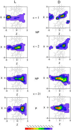The inclusion complex configurations for the enantiomers are determined in MD according to the most probable guest orientations corresponding to the preferred centre of mass positions. The regions with greatest probability of presence for Ile are located inside the cavity, although the preferred configuration depends on the enantiomer and solvent. Whereas the preferred location of L-Ile in vacuo is near the small rim of β–CD, the centre of mass position of this enantiomer tends towards the centre or the wide rim of the cavity with any solvent (Figure 5). The greatest probability of presence for D-Ile in vacuo is at the wide rim of β–CD, but this probability moves towards positions between the centre and the small rim of β–CD when ε increases. Solvent polarity does not influence the probability of presence in an inner position, whereas the results for Ile are smaller and distributed over larger areas when ε increases. The enantiomers preferably remain in favourably enantioselective regions, due to the greater differences in the interaction energy with β–CD.