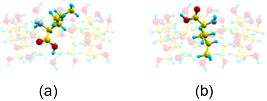 The most probable inclusion complex configurations for Ile enantiomers in vacuo deduced from the MD simulation, in which the carboxylic end of the amino acid is pointing towards (a) the narrow rim of β–CD; (b) the wide rim of β–CD. The guest molecule has been superimposed for clarity.