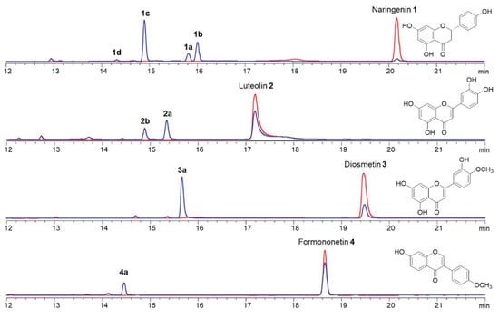 Figure 3. Product profiles of flavonoids 14 biotransformed in the I. fumosorosea ACCC 37814 cultures (reverse phase High Performance Liquid Chromatography (HPLC) traces recorded at 300 nm). HPLC traces of each standard substrate (colored in red) were used as references.