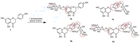 Scheme 1. The microbial transformation of naringenin 1 in the I. fumosorosea ACCC 37814 culture. Key Heteronuclear Multiple Bond Correlations (HMBC) correlations of each product are indicated by red arrows.