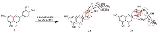 Scale-up biotransformations of flavonoids 1, 2, 3 and 4 by I. fumosorosea ACCC 37814 were carried out to obtain enough amount of their glycosides for NMR measurements. The fermentation culture was extracted by ethyl acetate and the resulting crude extract was subjected to silica gel column chromatography and semi-preparative HPLC to give the single compounds 1a1d, 2a, 2b, 3a and 4a (Figure 3). Their structures were unambiguously characterized by mass and NMR spectroscopic techniques.
