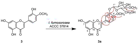 2.0 mg of compound 3a was isolated from the scale-up fermentation culture of I. fumosorosea ACCC 37814. The HRESIMS determined molecular weight of 3a was consistent with that of (4-O-methyl)glucosylated derivative of diosmetin 3. Detailed analysis of 1D- and 2D-NMR spectra further confirmed that 3a is the methylglucosylated derivative of diosmetin. HMBC interaction between the anomeric proton (δH 5.17, d, J = 7.8 Hz) and the oxygen-bearing aromatic carton at δC 146.5 (C-3′) indicated that the glucose unit was attached to OH-3′ of diosmetin (Scheme 3). The β-configuration of the glucosidic bond was proved by the coupling constant of the anomeric proton. HMBC correlation between the methoxy protons (δH 3.47, s) and the oxygen-bearing sp3-carbon at δC 79.1 (C-4′′) confirmed that the methylation has been taken place on the 4-OH of the glucose moiety. Thus, the structure of 3a was defined as 5,7-dihydroxy-4′-methoxyflavone 3′-O-β-d-(4-O-methyl)glucopyranoside.
