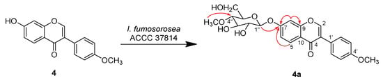 2.0 mg of compound 4a was purified from the scale-up biotransformation of formononetin 4 in the culture of I. fumosorosea ACCC 37814. The negative mode HRESIMS spectrum of 4a displayed a [M − H] ion at m/z 489.1422, indicating 4a was the methylglucosylated derivative of formononetin. This speculation was supported by the presence of resonance signals corresponding to a formononetin core, a d-glucose unit and a methoxy functional group in the 1H- and 13C-NMR spectra of 4a. HMBC interaction between the anomeric proton (δH 5.14, d, J = 7.8 Hz ) and the oxygen-bearing aromatic carton at δC 161.3 (C-7) as well as the large coupling constant of this anomeric proton indicated that the glucose fragment was attached to C-7 of formononetin via an O-β-glucosidic linkage. The HMBC spectrum of 4a also displayed cross peak between the methoxy protons (δH 3.47, s) and the oxygen-bearing sp3-carbon at δC 78.9 (C-4′′), confirming that the C-4 of the glucose moiety has a methoxy substituent (Scheme 4). Hence, the structure of 4a was elucidated as 4′-methoxyisoflavone 7-O-β-d-(4-O-methyl)glucopyranoside.