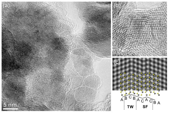 HRTEM image of (a) the ZnS nanoparticles revealing the size of the crystallites around or below 10 nm; (b) ZnS crystallite oriented along the (110) zone axis; (c) Wurtzite-type planar defects. The visible twin boundary and stacking fault defects are shown.