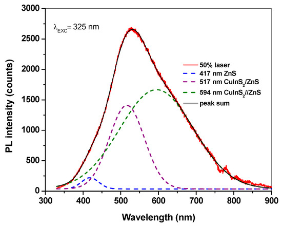 The optical properties of the mechanochemically synthesized CuInS2/ZnS nanocrystals were recorded by using micro-photoluminescence (micro-PL) spectroscopy. The room temperature micro-PL spectrum with the excitation wavelength at 325 nm is presented in Figure 5. The spectrum displayed a broad emission located between the peaks for bulk sphalerite ZnS and roquesite CuInS2. There are three resolvable peaks in the deconvoluted measured spectra. The emission peak located at 417 nm (2.96 eV—blue emission) can be attributed to ZnS and the peaks at 517 nm (2.38 eV—green emission) and 594 nm (2.08 eV—yellow emission) can be assigned to CuInS2/ZnS size dependent luminescence. The emission peaks are blue-shifted in relation to the band gap and may be attributed to band emissions from different small nanocrystalline domains or clusters and also to partial exchange between Zn and cations from CuInS2 (predominantly) with in [44]. The peak observed at 417 nm is in accordance with the weak one observed for ZnS published by Lee et al. in paper [45]. The peak at 517 and 594 nm may be attributed to CuInS2/ZnS in accordance with the PL spectra observed for CuInS2/ZnS QDs in paper [46]. The broad PL emissions are typically observed in chalcopyrite semiconductor nanocrystals, while the broad emission over 684 nm is in accordance with the one published by Li et al. [38] corresponding to CuInS2. The radiative recombination of excited electron-hole pairs in such nanocrystals is associated with deep defect states inside the band gap, being referred to as donor–acceptor pair recombination [6].