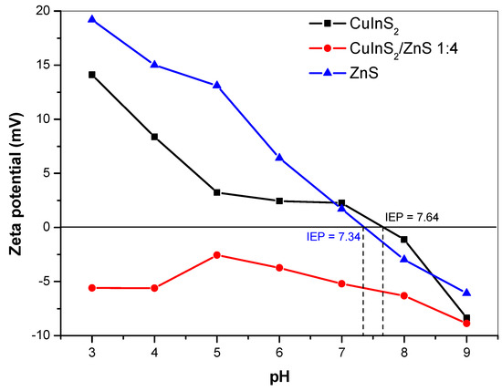 The zeta potential (ZP) in dependence of applied pH (in a range from 3 to 9) was measured for CuInS2, CuInS2/ZnS and ZnS samples. The ZP of the samples was measured in distilled water. The results are depicted in Figure 7. In the case of CuInS2 sample, the isoelectric point (IEP) was detected at pH = 7.64. With decreasing pH, the particles acquired positive values (up to +14 mV at pH 3) and with increasing pH, the charge became more negative (up to −8 mV at pH 9). As described earlier [40], CuInS2 compound prepared by mechanochemical route had a chalcopyrite crystal structure. In this structure, each S anion is tetrahedrally coordinated to two Cu cations and two In cations [49]. The positive ZP values below the IEP are the consequence of Cu(I) and In(III) cations contribution at a crystal surface. On the other hand, the negative ZP values above IEP are a sign of sulphate and hydroxides formation.