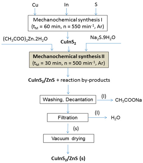 CuInS2/ZnS nanocrystals(in molar ratio 1:4 chosen on the basis of results previously published in papers [28,29] for similar nanocrystals) were prepared by co-milling of CuInS2, which was prepared by milling elemental copper (99.7%, Aldrich, Germany), indium (99.99%, Aldrich, Germany) and sulphur (99%, Ites, Slovakia) according to the procedure described in previous study [40] and precursors for preparation of ZnS according to the procedures described in papers [56,57]. Precursors for ZnS were zinc acetate dihydrate (99%, Ites, Slovakia) and sodium sulphide nonahydrate (98%, Acros Organics, USA). Preparation of the CuInS2/ZnS nanocrystals is depicted in Figure 8 and can be described by the following reactions: