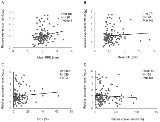 Relative expression of hsa-miR-381-3p and clinical parameters (A: mean PPD, B: mean CAL, C: BOP, and D: Plaque control record) using Pearson’s correlation coefficients between. N: number, r: Pearson’s correlation coefficients, p: p value. The relative expression of hsa-miR-381-3p was normalized by log10 transformation for the analysis.