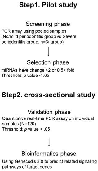 This study was carried out according to the Declaration of Helsinki (World Medical Association, 2002) and was admitted by the Ethics Committee of Okayama University Hospital (approval number: 1603-002). This study was designed as multiphase study (screening phase and selection phase, validation phase, and bioinformatics phase) to identify salivary miRNAs as biomarkers of periodontitis (Figure 2). In the screening phase and the selection phase (a pilot study), a comparison of salivary miRNAs profiles with no and mild (no/mild) and severe periodontitis patients was done to select candidate miRNAs reflecting periodontitis. In the next two phases (a cross-sectional study), the validation of selected salivary miRNAs in a pilot study was confirmed using the individual samples. After obtaining written informed consent, we recruited 120 patients (median age, 68.4 years) for participants from the Department of Preventive Dentistry, Okayama University Hospital. Participant recruitment was carried out from July 2016 to October 2016. This sample size was based on the number of patients that we were able to recruit during a 4-month period. All participants had been diagnosed with chronic periodontitis [32], and they did not have oral pain, oral disorders or dental treatments other than supportive periodontal therapy. Exclusion criteria were as follows; pregnancy, less than 40 years of age, use of anti-inflammatory drug, or the onset of acute inflammation of periodontal tissue within the 3-month period before the oral examinations.
