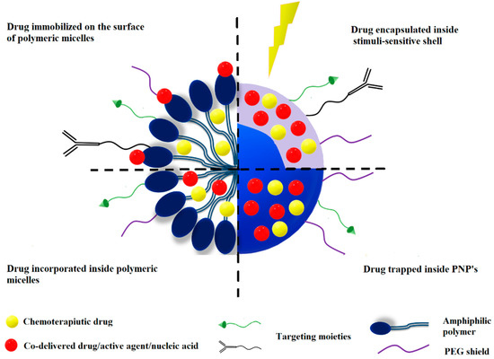 The aim of combining chemotherapeutics is to achieve an additive or even a synergistic effect. By targeting different pathways, combination therapy delivered by polymeric nanoparticles makes cancer cells more susceptible to the delivered therapeutic agents. Four commonly used approaches for co-delivery of therapeutic agents using polymeric nanoparticles are shown in Figure 1. Most drugs are passively loaded in polymeric nanoparticles according to their hydrophilicity. Hydrophobic molecules can be loaded in the hydrophobic moieties of micelles or polymersomes, and hydrophilic molecules are trapped in the hydrophilic compartments. Some drugs, such as nucleic acids, are co-loaded on the surface of the polymeric nanoparticles by electrostatic forces or chemical conjugations. Another approach is to directly conjugate drugs with the polymer through ester, amide or disulfide bonds [70]. Different types of polymeric nanoparticles can be further modified with targeting moieties.