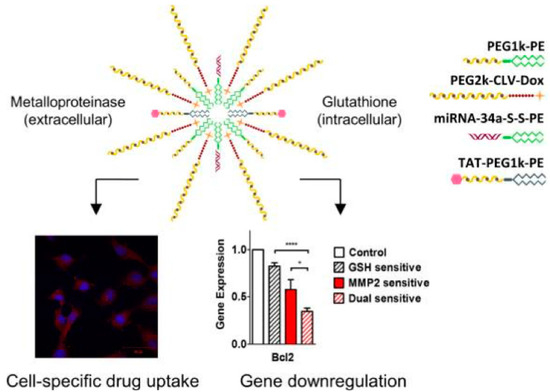 MMP-2 and glutathione sensitive polymeric nanoparticles used for co-delivery of DOX and miRNA-34a. Reproduced with permission from Salzano et al., Small; John Wiley and sons, 2016 [48]. * p ≤ 0.05, **** p ≤ 0.0001, n = 3, error bars represent mean ± SD.