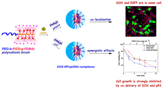 - Chen, W.; Zhang, M.; Shen, W.; Du, B.; Yang, J.; Zhang, Q. A Polycationic Brush Mediated Co-Delivery of Doxorubicin and Gene for Combination Therapy. Polymers 2019, 11, 60. [Google Scholar] [CrossRef]