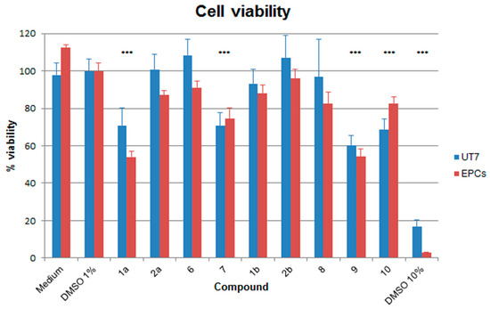 Effects of compounds on cell viability were determined in both UT7/EpoS1 and EPCs cell systems by a WST-8-based assay, a reagent that produces a formazan dye upon reduction in response to metabolic activity (CCK8 assay, Microtech). The cells were cultured for 48 h at 37 °C in medium containing 1% DMSO and each compound at its maximum concentrations of use established by the previous solubility tests. As controls, cells were also cultured in medium w/o DMSO, medium with 1% DMSO and medium with 10% DMSO. Results are reported in Figure 2, expressed as percentage viability with respect to medium with 1% DMSO. Reduction in cell viability was more pronounced in EPCs than UT7/EpoS1 cells, an effect already evident by culturing in 1% DMSO alone. However, presence of 1% DMSO did not alter cell viability to a significant extent in either cell system, while an almost complete loss of cell viability was induced by culturing in 10% DMSO. A relevant and significant reduction in cell viability, below 80% of control samples, was induced in both cellular systems by compounds 1a, 7, 9 and 10 (in this latter case, less for EPCs than UT7/EpoS1 cells).