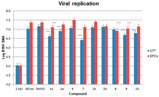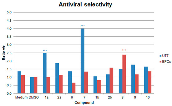 In UT7/EpoS1 cells. When compared to the 2 hpi samples, a ~2 Log increase in the amount of viral DNA was evident at 48 hpi in control samples, from 5.03 to 7.02–7.16 Log geq/104 cells. None of the compounds caused a complete inhibition of viral replication at 48 hpi, with final values in the range 6.41–7.13 Log geq/104 cells (Figure 3). When compared to the control samples (1% DMSO), a significant reduction in the amount of B19V DNA at 48 hpi occurred in the presence of the compounds 1a, 2a, 7, 9 and 10. However, this reduction could be related to the effects on the cells and not on their direct action against the virus, then, as a measure of selectivity in the inhibition of viral replication, the ratio between residual cell viability and viral replication was evaluated (ratio v/r). A relevant (v/r > 2) and statistically significant selectivity was observed only for compounds 1a and 7 (Figure 4).