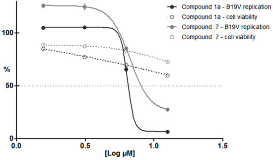 Compounds 1a and 7 showed the highest activity; however, they were among those compounds that could be tested at the highest concentration of 12.5 µM. Thus, these were also tested in UT7/EpoS1 cells at lower concentrations, for both antiviral and cell toxicity activities. Results are shown in Figure 5. Concerning antiviral activity, a steep dose-response curve was obtained, where the two higher concentrations tested could inhibit viral replication compared to control samples (calculated EC50 values ~ 6.4–6.7 µM). On the other hand, cell viability was also affected, but with a different and less significant dose-response curve. This discrepancy suggests that these two effects were not directly related to each other, and that some degree of specific antiviral activity could be attributed to tested compounds over a background of a more generic cytotoxic effect.