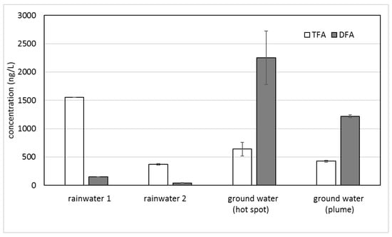 Concentrations of TFA and DFA in rainwater and ground water. Error bars show standard deviation (n = 2).