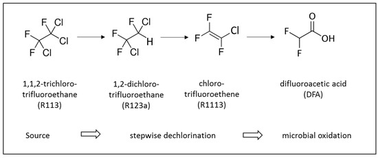 Figure 2 depicts the reductive dechlorination sequence of R113 via R123a to R1113 observed under anaerobic conditions in aquifers [15]. The high concentration of DFA in the contaminated ground water suggests a transformation of R1113 to DFA which, to the best of our knowledge, has not yet been reported under environmental conditions.