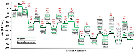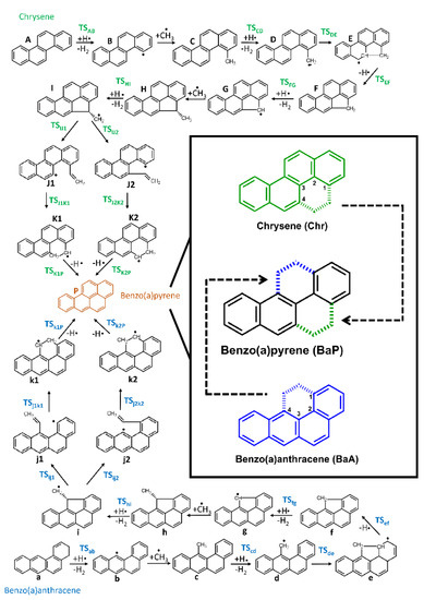 Critical stationary points were characterized by frequency calculations at both level of theories. In addition, to verify that the computed transition states (first-order saddle points) actually connected the desired starting materials and products (local minima). Intrinsic reaction coordinate (IRC) analysis [54] was carried out at the M06-2X/6-311++G(d,p) level of theory. The reaction and activation Gibbs free energies as well as the relative energies of the studied molecules were calculated. The reference levels of the two benzo(a)pyrene formation reaction channels (Figure 2) corresponded to chrysene (Chr) and benzo(a)anthracene (BaA) with four additional hydrogen atoms (4H●) and two methyl radicals (2●CH3) which served as reaction partners. Atomic balance was considered and the number of carbon and hydrogen atoms were kept the same by using additional species (hydrogen atoms, hydrogen molecules and methyl radicals) in each step of benzo(a)pyrene formation (Figure S2).