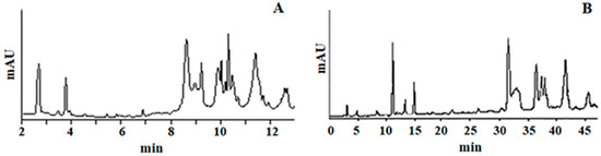 Figure 1. Profile of virgin olive oil (VOO) PF using (A) ultra-high performance liquid chromatography coupled to diode array detector (UHPLC-DAD) and (B) high performance liquid chromatography coupled to diode array detector (HPLC-DAD).