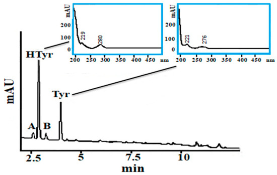 Figure 2. UHPLC-DAD recorded profile at 280 nm of the PF of a VOO sample after hydrolysis (the UV spectra corresponding to the peaks attributed to Htyr and Tyr, respectively, are shown in the inserts).