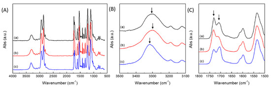 FT-IR spectra of PUEs in the whole range of wave numbers (A) and around specific wave numbers (B,C) in expansion: (a) BD–PU, (b) ISB–PU, and (c) IMN–PU.