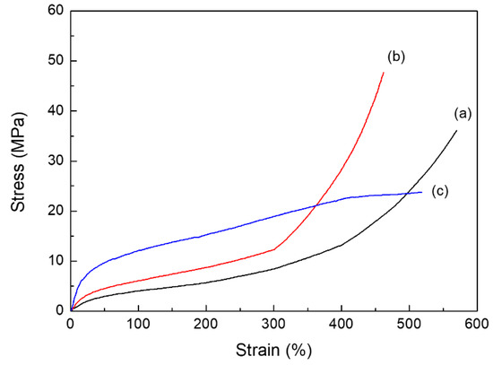 Stress–strain curves of (a) BD–PU, (b) ISB–PU, and (c) IMN–PU.