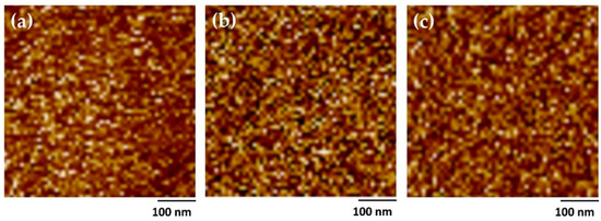 The microstructure and phase separation of the PUEs were confirmed by tapping-mode AFM and SAXS. Figure 5 displays AFM images of the PUEs. The darker and brighter regions correspond to the soft and hard segment domains, respectively [47,48]. In BD–PU (Figure 5a), the bright regions of sphere or cylinder like shapes are isolated and surrounded by the dark regions. This apparent phase difference evidences the contrast between the hard and soft segment domains. In ISB–PU and IMN-PU, the bright portions are smaller than in BD–PU slightly, but the striking differences between PUEs in this study were not observed.