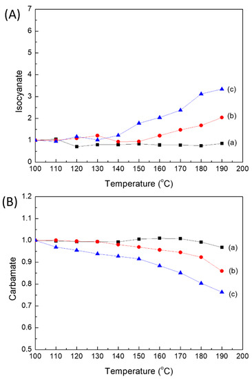 Temperature dependences of the relative intensities of the isocyanate peak at 2270 cm−1 (A) and carbamate peak at 1536 cm−1 (B) in FT-IR spectra: (a) BD–PU, (b) ISB–PU, and (c) IMN–PU.