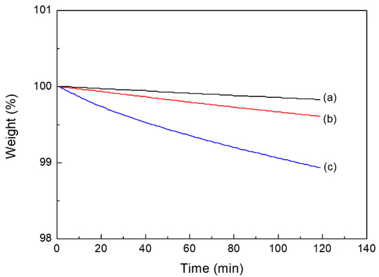 Isothermal TGA weight loss curves of PUEs at 180 °C: (a) BD–PU, (b) ISB–PU, and (c) IMN–PU.