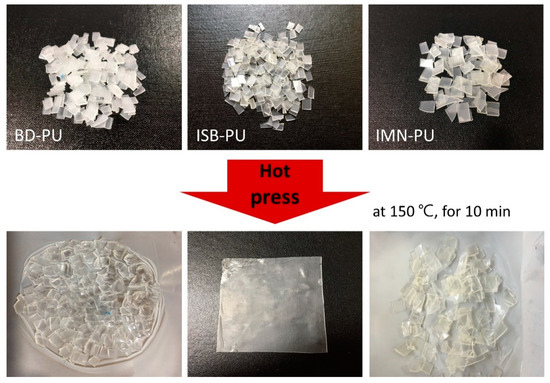 The reprocessing tests demonstrate whether ISB-based PU exhibits self-healing properties. When the ISB–PU film is damaged, the fractured pieces can be reprocessed into integrated film via the thermoreversible behavior of the PU. In the reprocessing analysis, the ISB–PU and BD–PU test pieces were placed between two metal plates and hot pressed at 150 °C for 10 min. Photo images of fractured BD–PU and ISB–PU films before and after heating are shown in Figure 9. After remolding, the ISB–PU film was reintegrated through reversible covalent bonding and physical melting. In contrast, the BD–PU test pieces remained nonintegrated and adhered only through partial melting, retaining a fractured appearance. IMN–PU also did not recover its shape after hot pressing. IMN-PU exhibited high reversibility than ISB–PU, but the flow temperature of IMN-PU was increased by the improved microphase separation.