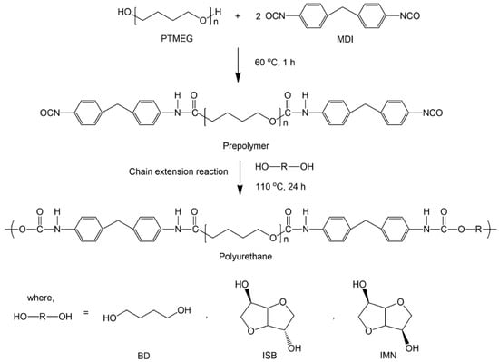 The PU prepolymer was prepared from poly(tetramethylene ether glycol) (PTMEG; Aldrich, Young-in, Korea) with a number-average molecular weight of 1000 g/mol as the polyol and 4,4′-methylenebis(phenyl isocyanate) (MDI; Aldrich) as the diisocyanate. The chain extenders were 1,4-butanediol (BD; Aldrich), isosorbide (ISB; Samyang Corporation, Dae-jeon, Korea), and isomannide (IMN; Aldrich). Prior to the reaction, the polyol was dehydrated under vacuum conditions at 60 °C for 1 day, and ISB and IMN were dried in a vacuum evaporator at 90 °C for 6 h.