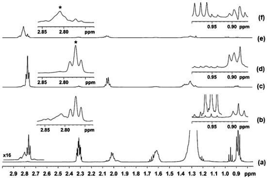 (a) Selected region of a 500 MHz 1H-NMR spectrum of the lipid fraction of a lyophilized bovine milk sample in CDCl3. (b) Magnification of the respective 1H-NMR regions T= 298 K; number of scans, 256; acquisition time 4.3 s; relaxation delay, 5 s; total experimental time ~25 min). (c) and (e) 1D TOCSY spectra; (d) and (f) are the magnification of the respective 1H-NMR regions, τm = 200 ms, number of scans, 256 and total experimental time ~25 min; the asterisks (*) denote the resonances of the allylic protons that were excited with the use of a selective shaped pulse of 80 ms.