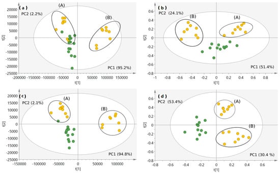 Score plots obtained after the PCA and PLS-DA analyses on the UNor and NorCont data of the lipid fraction of organic and conventional processed (P) milk samples. (a) PCA score plot of UNor procedure, (b) PLS-DA score plot of the NorCont procedure, (c) PCA score plot of the UNor procedure, (d) PLS-DA score plot of the NorCont procedure. Yellow circles for conventional and green circles for organic samples; (A), conventional milk samples consisted of 1.5% fat content and (B), conventional milk samples consisted of 3% fat content.