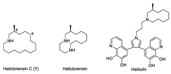 1. Sorek, H.; Rudi, A.; Aknin, M.; Gaydou, E.M.; Kashman, Y. Isohalitulin and haliclorensins B and C, three marine alkaloids form Haliclona tulearensis. J. Nat. Prod. 2010, 73, 456–458. [Google Scholar] [CrossRef]