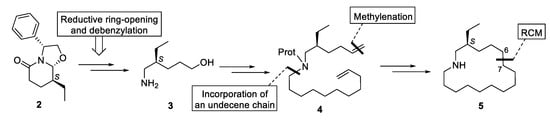 The assembly of the azacyclohexadecane ring of 5 would be accomplished by a ring-closing metathesis (RCM) reaction of an appropriate N-(hexenyl)undecenylamine 4 (bond formed C6-C7), which would be prepared from amino alcohol 3, easily available from bicyclic lactam 2, by incorporation of a C11 chain bearing a terminal double bond and subsequent methylenation of the pentanol moiety (Scheme 1).