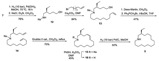 To overcome the above drawbacks, we then focused on an alternative approach in which the undecene chain would be introduced by alkylation of the known [6] nosyl-protected amine 12 with undecenyl bromide. This activated amine was satisfactorily prepared in 76% overall yield by debenzylation of amino diol 7 by hydrogenolysis, followed by reaction of the resulting crude amino alcohol 3 with o-nitrobenzenesulfonyl chloride (Scheme 3). The alkylation step was performed in the presence of Cs2CO3, leading to alcohol 13 in excellent yield (84%). A subsequent Dess-Martin oxidation, followed by a Wittig methylenation of the resulting aldehyde, afforded N-(hexenyl)undecenylamine 14 in 47% overall yield. Macrocyclization of diene 14 took place satisfactorily by ring-closing metathesis using the second-generation Grubbs catalyst in refluxing dichloromethane under dilute solvent conditions, providing a 88:12 diastereoisomeric mixture of E/Z cycloalkenes 15 in 70% yield. Removal of the nosyl group by treatment with thiophenol, followed by catalytic hydrogenation of the resulting mixture of azamacrocyclic alkenes 16, afforded the ethyl analog of haloclorensin C (5).