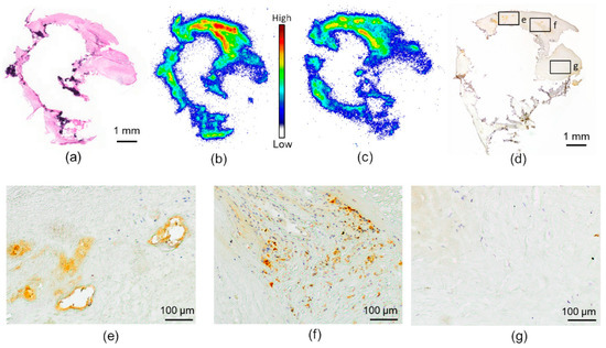 The human carotid artery sample showed partially calcified fibroatheroma-type plaque characteristics (Figure 2a). When incubated with [18F]Flutemetamol in vitro, the sections showed tracer accumulation in some of the non-calcified areas of the plaque (Figure 2b). [18F]Flutemetamol uptake was reduced when incubated with excess non-radioactive PIB, especially in the high-uptake areas (Figure 2c). The consecutive Aβ-stained sections showed positive staining in the area of the highest tracer uptake, whereas the calcified and fibrotic areas with low tracer uptake were negative for Aβ (Figure 2d–g).