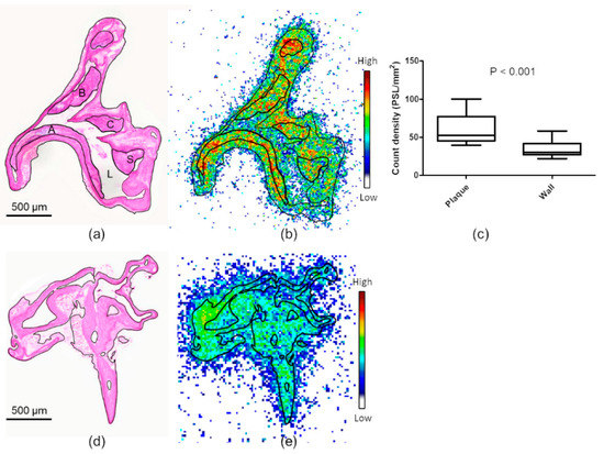 The atherosclerotic mice showed large fibroatheroma-type plaques in the aorta (Figure 3a), while no lesions were observed in the healthy controls. [18F]Flutemetamol accumulated in the aortas of both atherosclerotic and control mice (respective radioactivity concentrations: 0.81 ± 0.21 vs. 0.65 ± 0.20%ID/g, p = 0.12). In the autoradiography of atherosclerotic aortas (Figure 3b), the highest observed PSL/mm2 values were found in plaque calcifications (93 ± 30 PSL/mm2). By comparison, the mean uptake was 52 ± 8.6 PSL/mm2 in non-calcified plaques and 30 ± 5.0 PSL/mm2 in lesion-free vessel wall (p < 0.001). Uptake did not significantly differ between plaque areas of low and high macrophage infiltration (53 ± 13 vs. 52 ± 12 PSL/mm2). The adventitial uptake was 49 ± 8.7 PSL/mm2. The mice studied at the 60 min time point showed less uptake in the plaques than did the mice studied at 30 min post-injection (32 ± 4.6 PSL/mm2, p = 0.0039), whereas the uptake in the other ROIs was comparable. In the control mice, the largest radioactivity accumulation occurred in the adventitia (57 ± 10 PSL/mm2), while the uptake in healthy vessel wall was 32 ± 7.2 PSL/mm2.