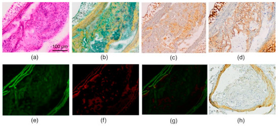 In histology studies, the mouse aortic sections showed cell-rich plaques with lipids and fibrotic tissue (Figure 4a,b). The cells were mainly macrophages, as can be seen by the Mac-3 staining (Figure 4c). The ox-LDL-immunostained sections showed that oxidatively modified LDL was abundant in the atherosclerotic lesions (Figure 4d). Thioflavin-S-stained sections showed green fluorescence under the microscope, both in the media and in the atherosclerotic lesions (Figure 4e). The observed fluorescence in the media was confirmed to be mainly autofluorescence (Figure 4f,g). Aβ immunostaining was the most prominent in the media, with only a minimal amount of positive staining being shown in the plaques (Figure 4h).