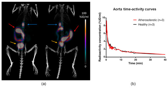 Examples of [18F]Flutemetamol in vivo PET/CT images. (a) PET/CT of a healthy C57BL/6N mouse (left) and atherosclerotic IGF-II/LDLR−/−ApoB100/100 mouse (right) at 30 min post-injection. High radioactivity is seen in the gallbladder (blue arrows), intestine (red arrows), and urinary bladder (yellow arrows). The kidneys are also faintly visible. (b) Time-activity curves in aorta show no difference between the atherosclerotic and healthy mice.