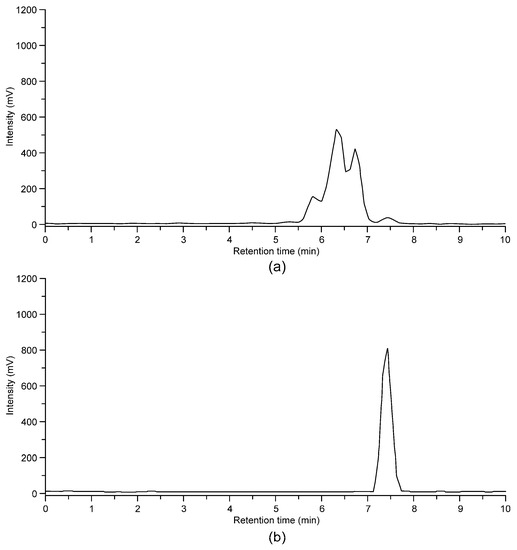 The mice rapidly metabolized [18F]Flutemetamol into various unidentified radioactive metabolites. At 30 min post-injection, intact [18F]Flutemetamol comprised 19% ± 5.4% and 17% ± 0.74% of total plasma 18F radioactivity in atherosclerotic and control mice, respectively. The vast majority of the 18F radioactivity in the urine was derived from metabolites, and only approximately 1% was derived from the intact tracer. An example of [18F]Flutemetamol high-performance liquid chromatography (HPLC) chromatogram is shown in Figure 6.
