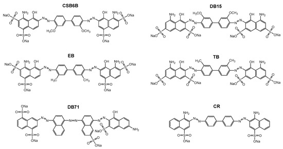 Structure of CSB6B and five sulfonated aryl diazo compounds that have structures similar to that of CSB6B, Evans blue (EB), Direct blue 15 (DB15), Trypan blue (TB), Direct blue 71 (DB71), and Congo red (CR).