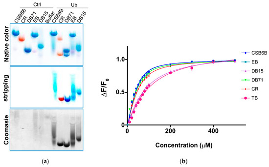 After the discovery of Chicago sky blue 6B (CSB6B) as an inhibitor of ubiquitin, we tested and observed the inhibitory activities of various structurally similar sulfonated aryl diazo compounds using the same assay method as described previously [35]. Aryl diazo compounds included Evans blue (EB), Congo red (CR), Direct blue 15 (DB15), Direct blue 71 (DB71), and Trypan blue (TB), in addition to CSB6B (Figure 1). It was observed that these compounds inhibited USP5 by binding to ubiquitin instead of binding to the enzyme as previously [35]. On the native polyacrylamide gel electrophoresis (N-PAGE), the mobility shifts of both ubiquitin and the compounds in the mixtures in comparison with free compounds or ubiquitin were clearly observed (Figure 2a).