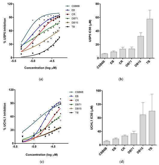 In order to establish structure–activity relationships within this class of compounds, dissociation constants (Kd) for the binding affinity between each compound and ubiquitin, and half maximal inhibitory concentration (IC50) values against two DUBs, USP5 specific for unanchored polyubiquitin chains [36] and ubiquitin c-terminal hydrolase L1 (UCHL-1) specific for processing of ubiquitin precursors, [37] were measured. Thus, in the intrinsic fluorescence quenching assay, EB, CR, and DB71 showed binding affinities similar to that of CSB6B, whereas DB15 and TB showed substantially lower binding affinities (Figure 2b and Table 1). Consistent with this result, EB, CR, and DB71 showed considerably lower IC50 values against the activity of both USP5 (Figure S1a, Figure 3a,b and Table 2) and UCHL1 (Figure S1b, Figure 3c,d and Table 2) on the GST-Ubiquitin-HA, compared to that of DB15 and TB.