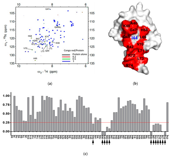 All 1H,15N-HSQC spectra were obtained at 25 °C using a gNhsqc pulse sequence on a Varian Unity Inova 500 MHz spectrometer at the National Institutes of Environment and Health Science (National Institutes of Health in North Carolina, Durham, NC, USA). The chemical shifts of amide backbone were assigned by the simulation and extraction of the ubiquitin chemical shift data deposited at the Biological Magnetic Resonance Data Bank (BMRB entry number: 6457). Chemical shift perturbation (CSP) experiments using 1H,15N-HSQC spectra were performed in NMR buffer containing 10% D2O. The 1H,15N-HSQC spectra of 100 μM 15N-labeled ubiquitin were monitored by titrating Congo red, respectively, with chemical/protein ratios of 0.2, 0.5, 1, and 2. The intensity reduction ratio (ΔI) of peaks observed in the intermediate exchange rate between free and bound forms, in the NMR time scale, was employed to determine the binding surface of ubiquitin to each chemical. It was calculated by the following equation: