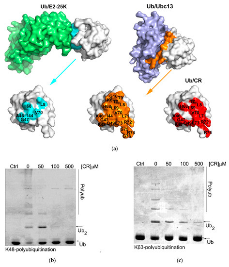 CR inhibits K48- and K63- polyubiquitination in vitro. (a) Interacting surface of ubiquitin when complex with E2-25K and Ubc13 compared with the surface used for CR binding. (b,c) CR inhibits K48- (b) and K63-ubiquitinations (c). First, mono ubiquitin was mixed with UBA1, E2-25K or complex Mms2/Ubc13, and 0–500 µM CR in the presence or absence of ATP regeneration system. Then the mixture was incubated at 37 °C for 24 h. The reaction was stopped by adding 5X SDS loading buffer and the results were analyzed with 15% SDS-PAGE.